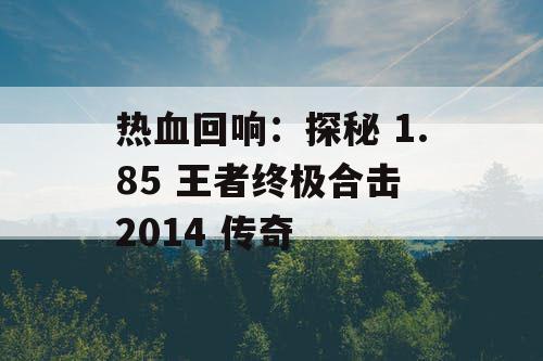 《热血回响:探秘 1.85王者终极合击》是一部2014年的传奇游戏,该游戏以热血的战斗和刺激的合击技能为特点,吸引了众多玩家的关注。游戏中玩家可以体验到丰富的游戏剧情和多样的游戏玩法,同时还可以与其他玩家进行互动和交流。该游戏以其独特的魅力,成为了当时备受追捧的传奇游戏之一。